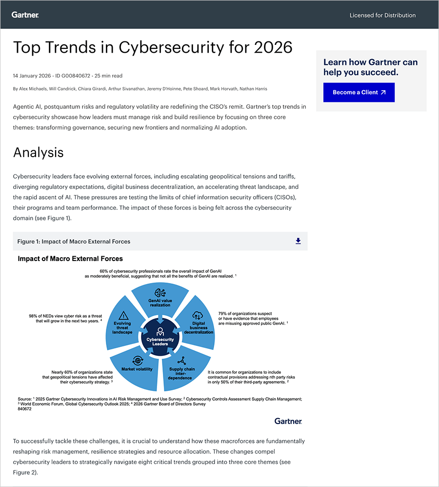 AI and quantum technologies are advancing faster than traditional security models can adapt. At the same time, evolving global regulations are increasing scrutiny, accountability, and reporting requirements for security leaders. We believe this Gartner® report helps CISOs and CIOs understand how these forces intersect — enabling them to prioritize investments, adapt governance models, and build resilience without slowing innovation.